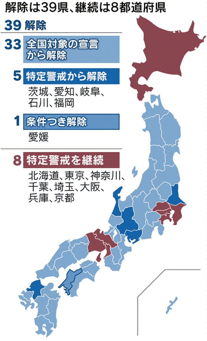 新型コロナ 緊急事態宣言 39県を解除 首相 県境越える移動自粛を 日本経済新聞